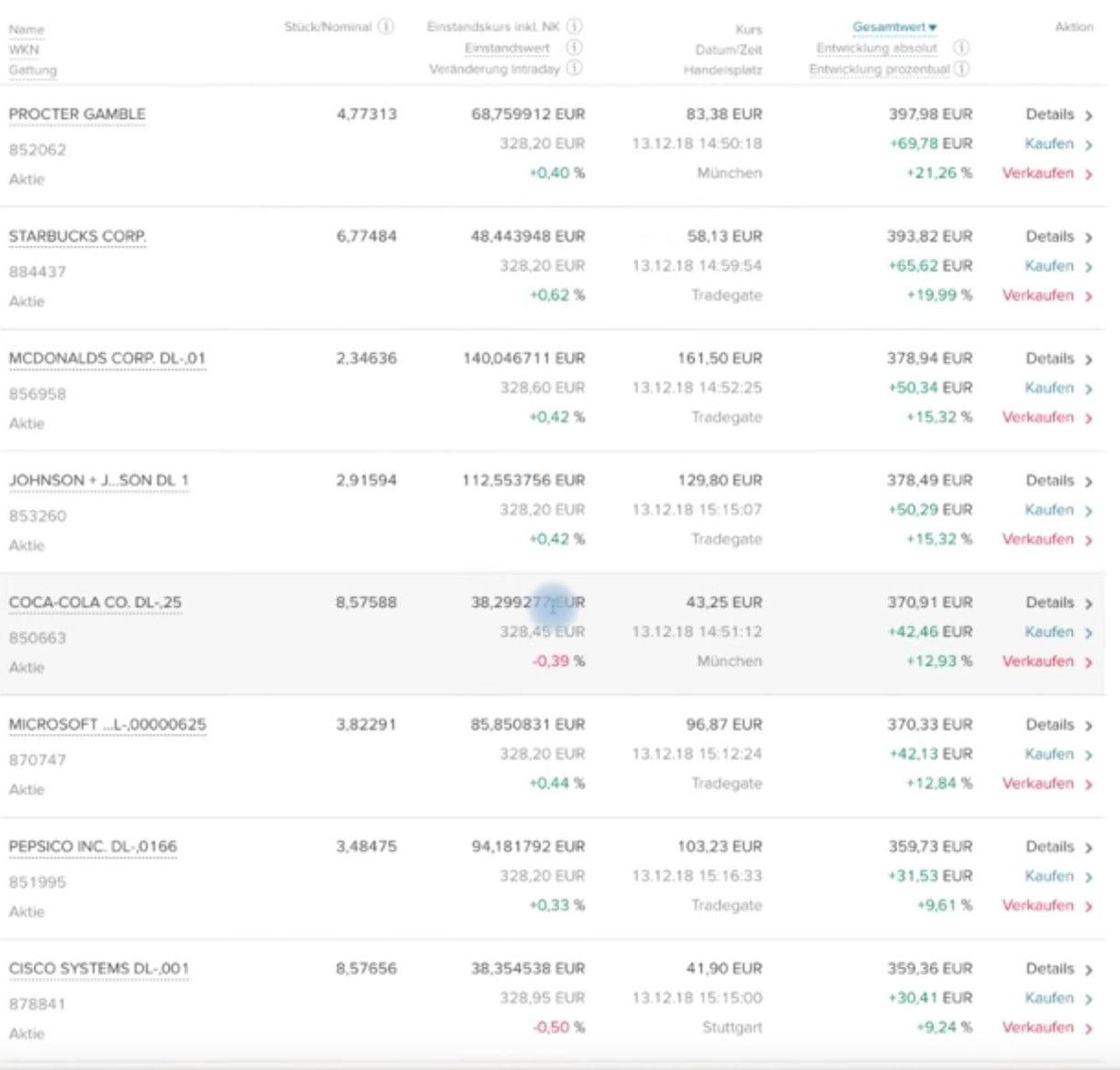 Mit diesem Screenshot möchte ich einmal den Wert des Depots vom 16. Dezember aufzeigen. Eins muss man dazu sagen, auch wenn die meisten Werte im grünen Bereich liegen, sollte man sich nicht erfreut darüber sein. Denn so muss man für die Käufe mehr zahlen, als man dies bisher getan hat. Am besten wäre, der Wert der Aktien würde fallen um mehr Anteile davon zu erwerben und wenn man nichts mehr kaufen möchte – dann kann der Wert steigen. Aber das ist nur ein Wunsch 😉