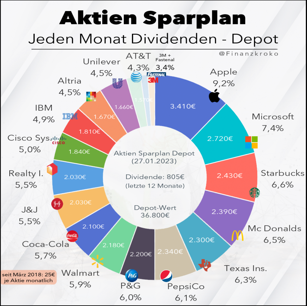 Auch im Jahr 2023 läuft mein Projekt (Aktiensparplan) „Jeden Monat Dividende kassieren„, welches ich im März 2018 gestartet hatte weiter – läuft also demnach bereits seit über 59 Monaten (4,5 Jahre). Ich investiere jeden Monat in 16 Aktien jeweils 25 Euro. Hinzu kommen mittlerweile das 17. mit 3M und das 18. mit Fastenal, 2 erstklassige Dividenden Aktien hinzu, welche nur von der erhaltenen Dividende finanziert werden. Das Geld was Geld macht, macht wiederum Geld. Das ist der Hammer!